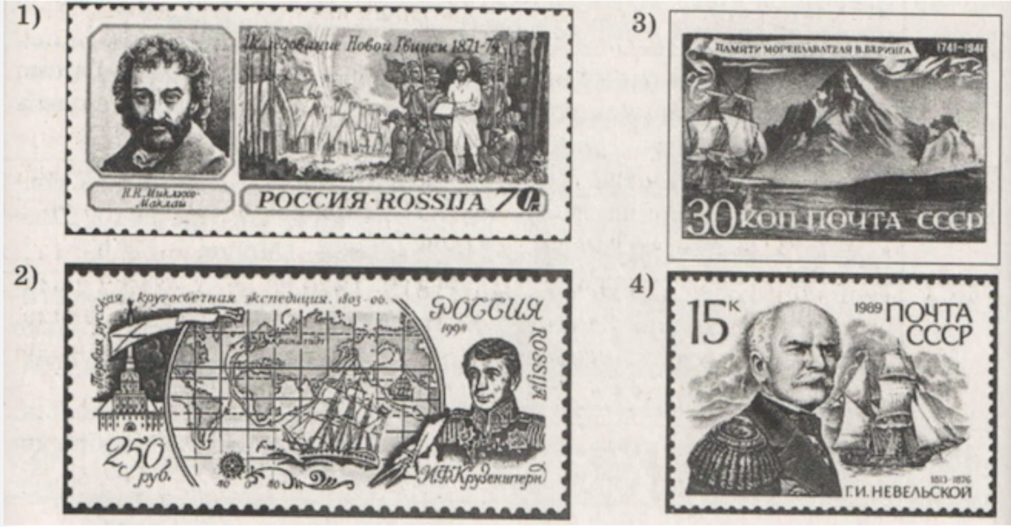 Какая из представленных ниже марок иллюстрирует достижения русских путешественников, совершённые в той же четверти века, что и открытие, показанное на памятном конверте? В ответе запишите цифру, которой обозначена эта марка. Укажите монарха, в период правления которого была совершена эта экспедиция.