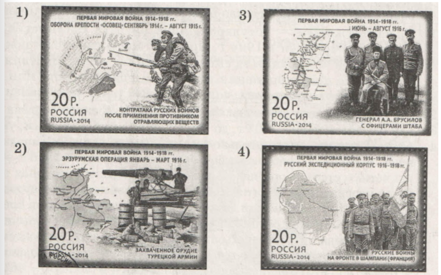 На какой из представленных ниже марок отражены события, связанные с генералом, чьим именем (фамилией) названа книга, показанная выше? В ответе запишите цифру, которой обозначена эта марка. Укажите название операции, проведенной фронтом, которым командовал этот генерал в 1916 г.