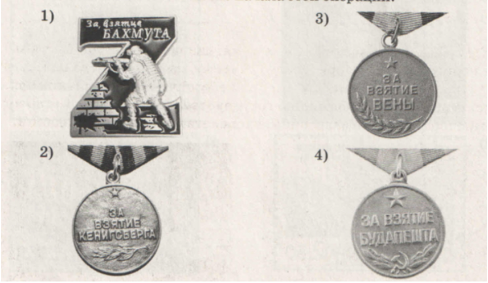 Какая из представленных наград вручалась воинам в ходе той же операции, при выполнении задач которой совершили подвиги военнослужащие, показанные на марках? В ответе запишите цифру, которой обозначена эта награда. Укажите названия четырёх регионов, вошедших в состав России после начала этой операции.