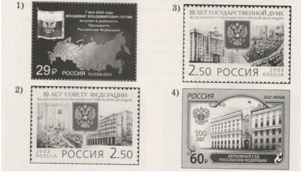 На какой из марок показано здание, в котором располагается Высший представительный и законодательный орган власти в России? В ответе запишите цифру, которой обозначена эта марка. Укажите название Высшего законодательного органа России, в котором работают по два представителя от каждого региона России, представляющие интересы субъектов России на федеральном уровне.