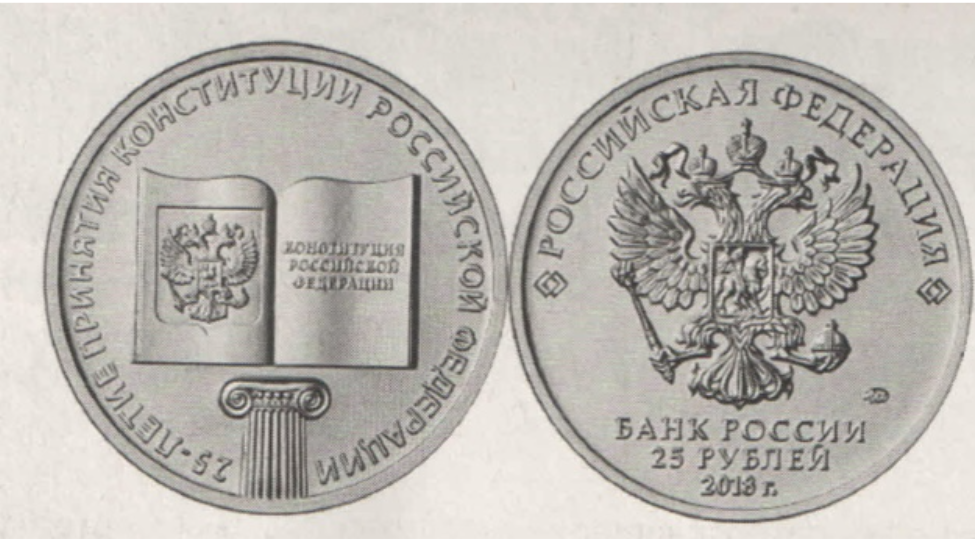 Укажите год, когда была принята Конституция России, юбилею которой посвящена монета. Используя изображение, приведите одно любое обоснование вашего ответа.
