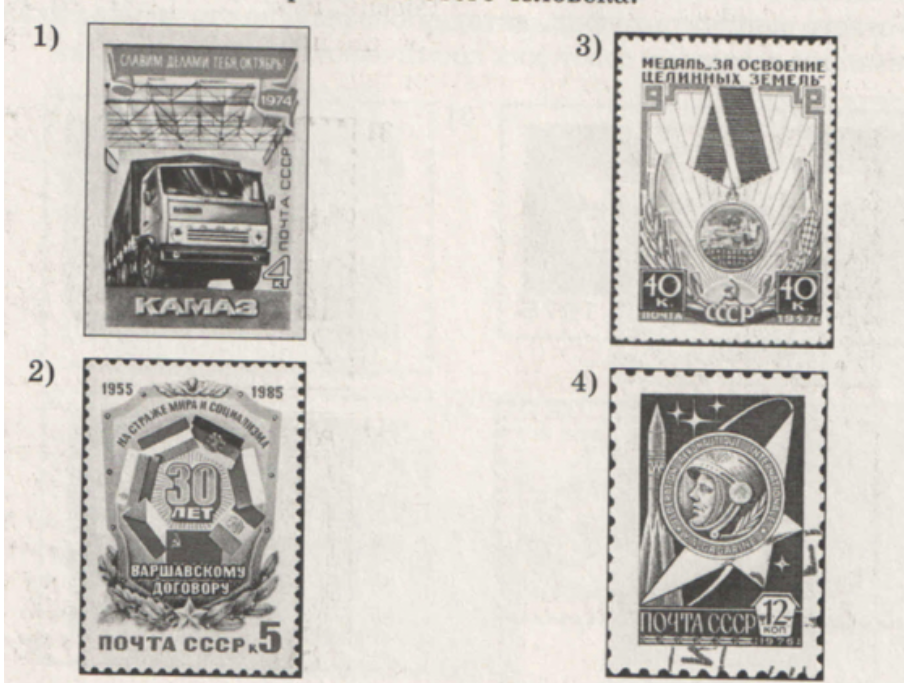 Какое из представленных ниже на марках событий произошло в период, когда человек, показанный на иллюстрации выше, занимал высший пост в КПСС? В ответе запишите цифру, которой обозначена эта марка. Укажите фамилию этого человека.