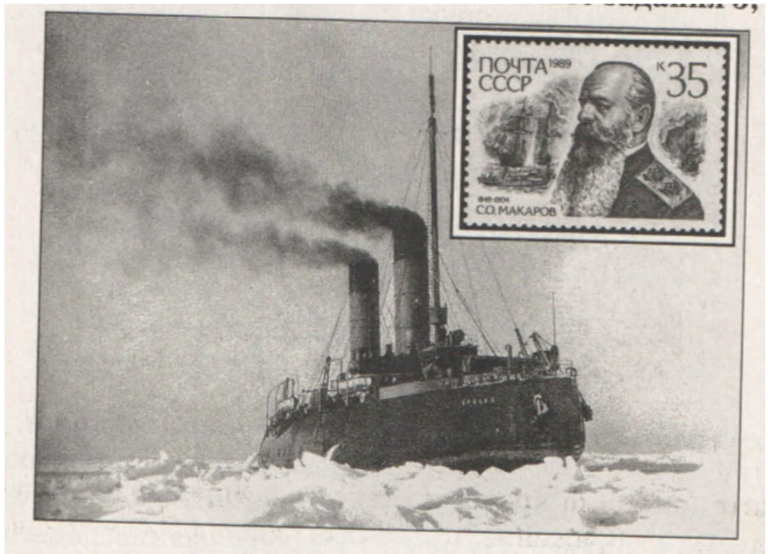 Укажите название ледокола, построенного по инициативе и при прямом участии адмирала, изображённого на марке. Используя изображение, приведите одно любое обоснование вашего ответа.