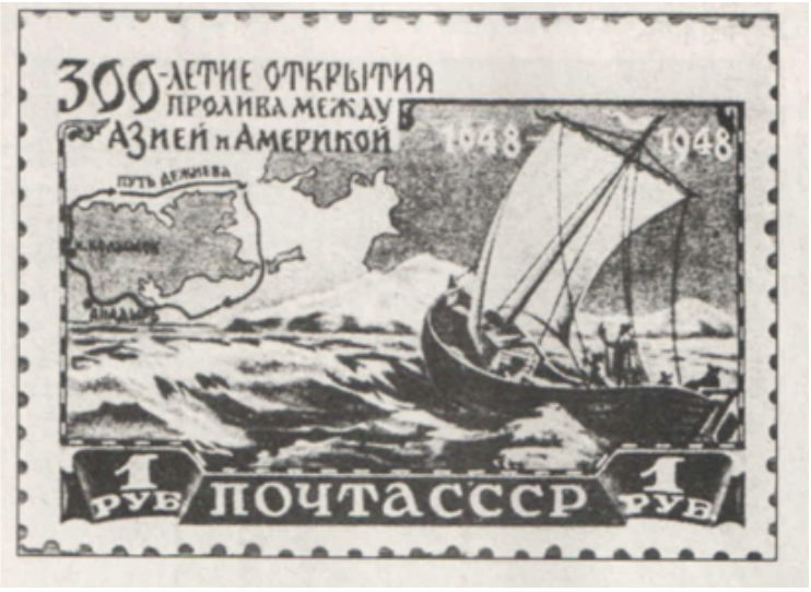 Укажите название пролива между Азией и Америкой, данное ему в XVIII в. мореплавателем Дж. Куком. Опираясь на изображение на марке, укажите название самого восточного мыса Азии. Используя изображение, приведите одно любое обоснование вашего ответа.