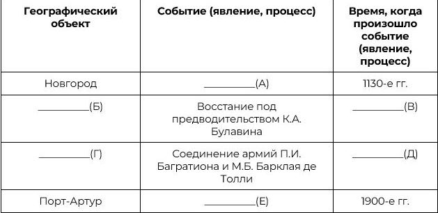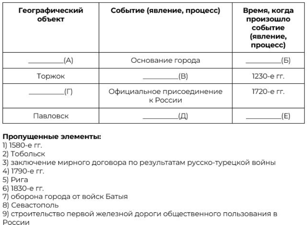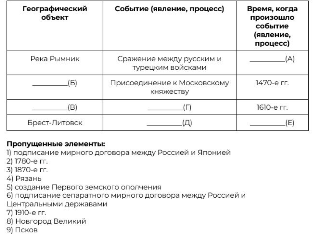 Заполните пустые ячейки таблицы, используя приведённый ниже список пропущенных элементов: для каждого пропуска, обозначенного буквой, выберите номер нужного элемента.