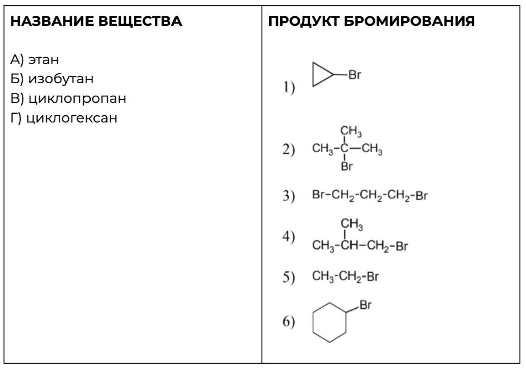 Установите соответствие между названием вещества и продуктом, который преимущественного образуется при взаимодействии этого вещества с бромом: к каждой позиции, обозначенной буквой, подберите соответствующую позицию, обозначенную цифрой.