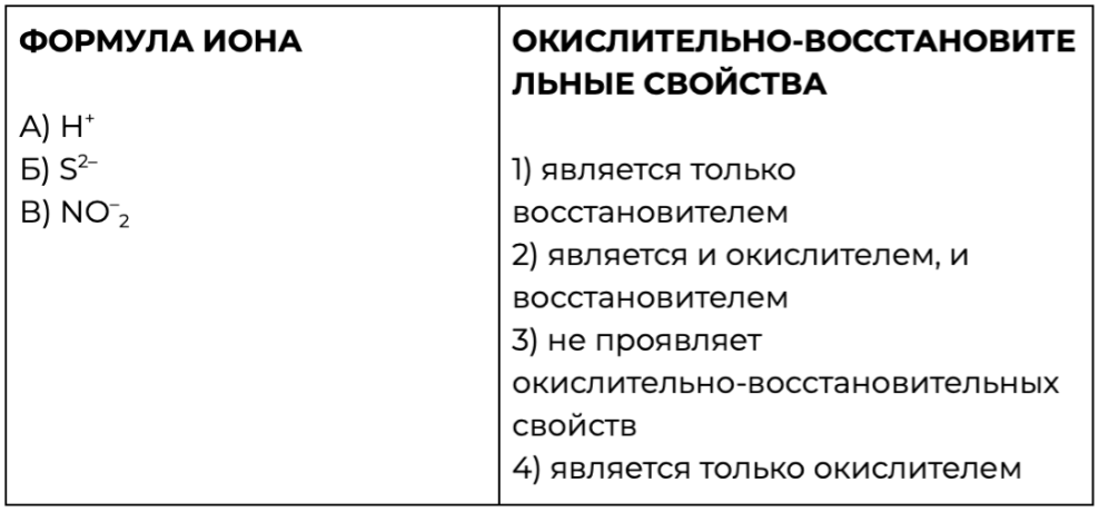 Установите соответствие между формулой иона и окислительно-восстановительными свойствами, которые он способен проявлять: к каждой позиции, обозначенной буквой, подберите соответствующую позицию, обозначенную цифрой.