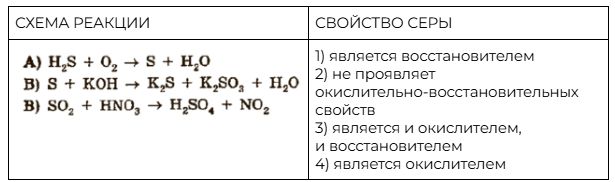 Установите соответствие между схемой реакции и свойством серы, которое этот элемент проявляет в этой реакции: к каждой позиции, обозначенной буквой, подберите соответствующую позицию, обозначенную цифрой.