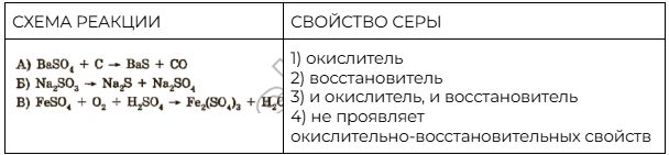 Установите соответствие между схемой реакции и свойством серы, которое этот элемент проявляет в этой реакции: к каждой позиции, обозначенной буквой, подберите соответствующую позицию, обозначенную цифрой.
