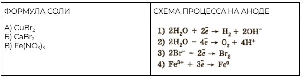 Установите соответствие между формулой соли и схемой процесса, протекающего на инертном аноде при электролизе водного раствора этой соли: к каждой позиции, обозначенной буквой, подберите соответствующую позицию, обозначенную цифрой.