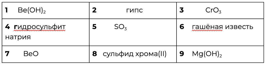 Среди предложенных формул/названий веществ, расположенных в пронумерованных ячейках, выберите формулы/названия: А) соли сернистой кислоты; Б) щёлочи; В) амфотерного оксида.