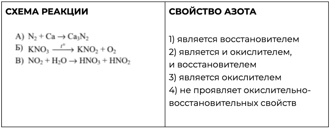 Установите соответствие между схемой реакции и свойством азота, которое этот элемент проявляет в данной реакции: к каждой позиции, обозначенной буквой, подберите соответствующую позицию, обозначенную цифрой.