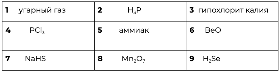 Среди предложенных формул/названий веществ, расположенных в пронумерованных ячейках, выберите формулы/названия: А) кислоты; Б) средней соли; В) кислотного оксида.