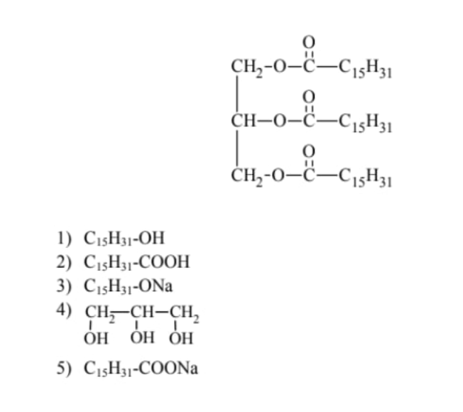 Из предложенного перечня выберите два вещества, которые образуются при щелочном гидролизе жира, формула которого