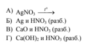 ИСХОДНЫЕ ВЕЩЕСТВА | ПРОДУКТ(Ы) РЕАКЦИИ 1) AgNO3, NO и H2O 2) Ca(NO3)2, NH4NO3 и H2O 3) Ag2O, NO2 и O2 4) Ag, NO2 и O2 5) Ca(NO3)2 и H2O 6) AgNO3 и H2 |