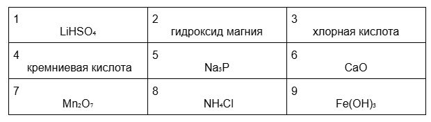 Среди предложенных формул и названий веществ, расположенных в пронумерованных ячейках, выберите формулу или название, соответствующее: