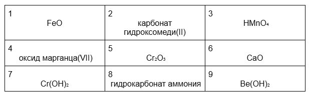 Среди предложенных формул и названий веществ, расположенных в пронумерованных ячейках, выберите формулу или название, соответствующее: