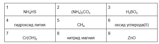 Среди предложенных формул и названий веществ, расположенных в пронумерованных ячейках, выберите формулу или название, соответствующее: