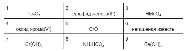 Среди предложенных формул и названий — веществ, расположенных в пронумерованных ячейках, выберите формулу или название, соответствующее:
