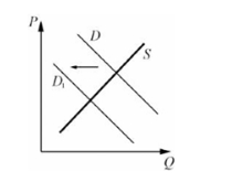 На графике изображено изменение ситуации на рынке одежды из натуральной кожи. Кривая спроса переместилась из положения D в положение D1 при неизменном предложении S. (На графике P — цена товара; Q — количество товара.)