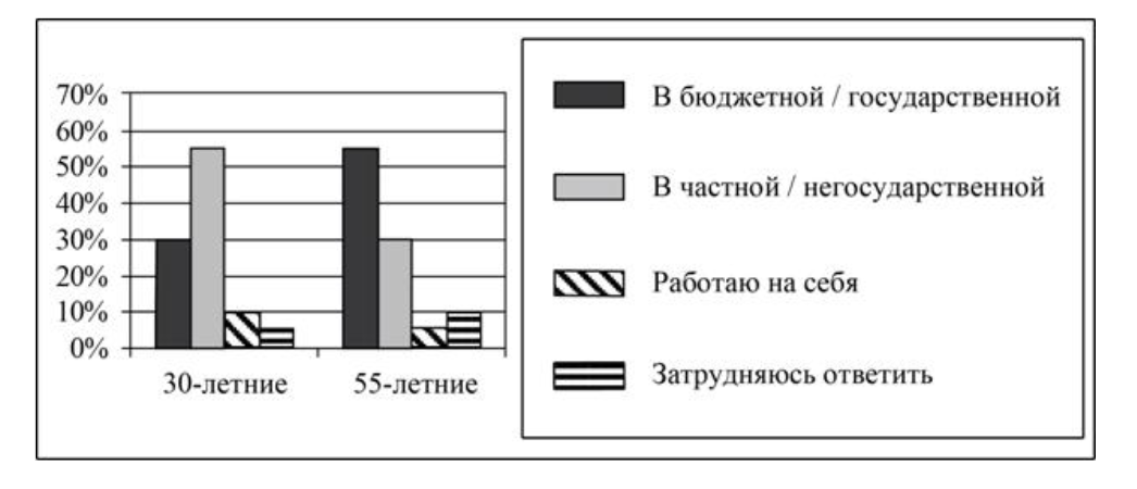 В ходе социологического опроса 30-летних и 55-летних граждан страны Z им задавали вопрос: «В какой организации Вы работаете (бюджетной / государственной или частной / негосударственной)?» Результаты опроса (в % от числа отвечавших) представлены на диаграмме.