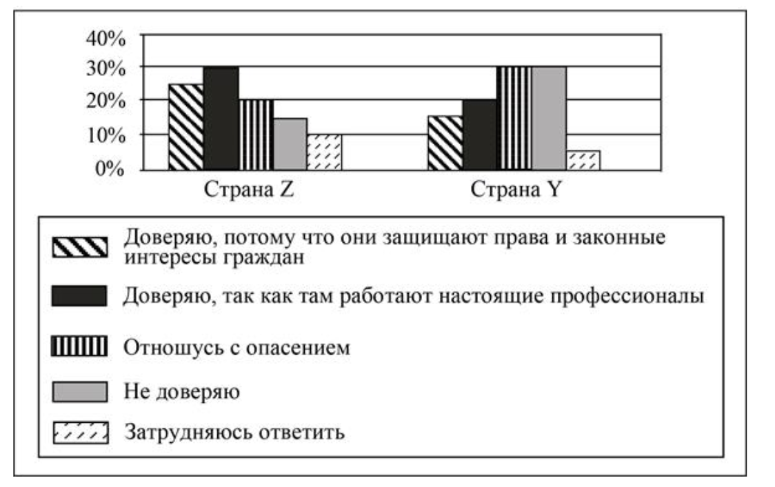 Фонд изучения общественного мнения провёл среди совершеннолетних граждан стран Z и Y опрос: «Доверяете ли Вы правоохранительным органам?» Полученные результаты (в % от числа опрошенных) представлены в виде диаграммы.