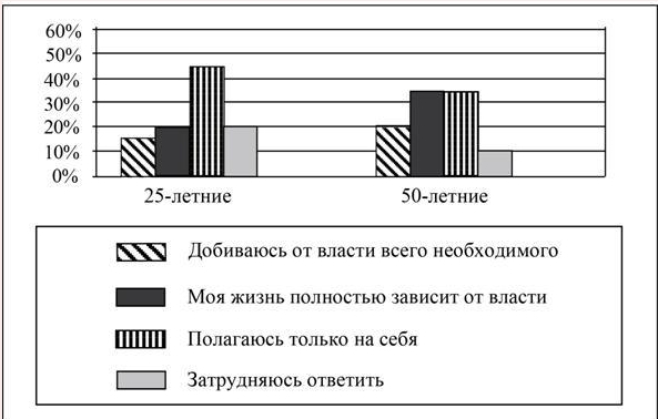 В ходе социологических опросов 25-летних и 50-летних граждан страны T им предлагали определить характер их отношений с властью.Полученные результаты (в % от числа опрошенных) представлены в виде диаграммы.