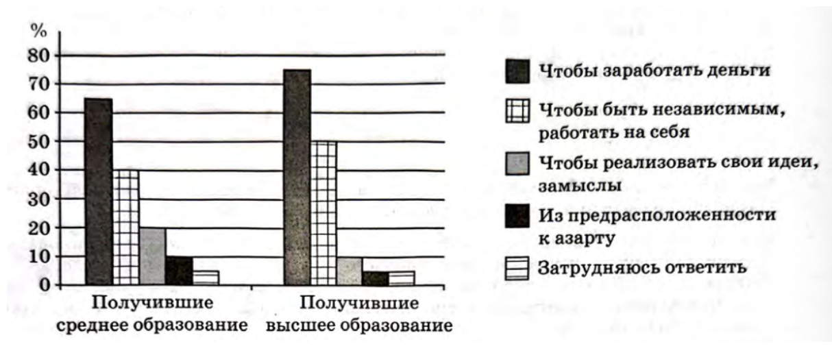 В ходе социологического опроса совершеннолетних граждан страны Z, имеющих разные уровни образования, им задавали вопрос: «Как Вы думаете, почему люди занимаются предпринимательством?» (Можно было выбрать не более двух ответов.) Результаты опросов (в % от числа отвечавших) приведены на диаграмме.