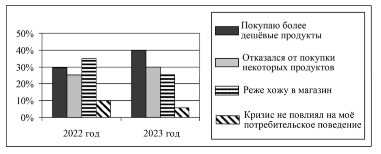 Учёные, анализируя данные социологических опросов, изучали потребительское поведение совершеннолетних граждан в условиях экономического кризиса. На диаграмме приведены данные (в % от числа отвечавших) о том, как в течение года изменилось потребительское поведение.
