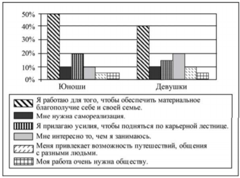 В ходе социологического опроса 23-летних работающих юношей и девушек страны Т им задавали вопрос: «Зачем Вы работаете, какова Ваша трудовая мотивация?». Полученные результаты (в % от числа опрошенных) представлены в виде диаграммы.