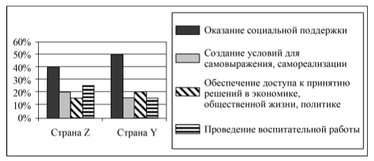 В ходе социологических опросов совершеннолетних жителей стран Z и Y им задавали вопрос: «Какое из направлений молодёжной политики государства Вы считаете наиболее важным?» Результаты опросов (в % от числа отвечавших) приведены на диаграмме.