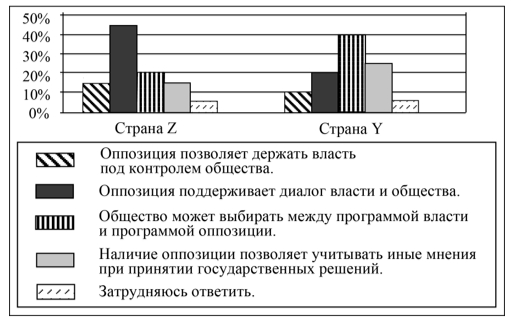 В ходе социологических опросов совершеннолетних жителей стран Z и Y им предлагали высказать своё мнение о роли оппозиции в политической жизни страны. Полученные результаты (в % от числа опрошенных) представлены в виде диаграммы.