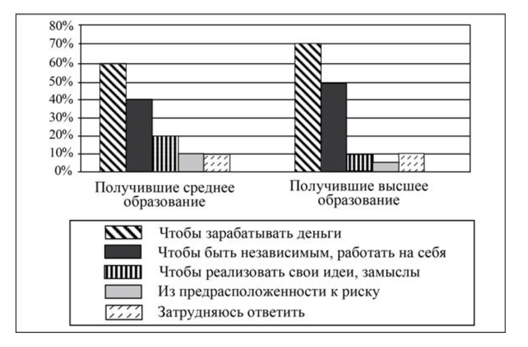 В ходе социологического опроса совершеннолетних граждан страны Z, имеющих разный уровень образования, им задавали вопрос: «Как Вы думаете, почему люди занимаются предпринимательством?» (можно было выбрать не более двух ответов). Результаты опросов (в % от числа отвечавших) приведены на диаграмме.