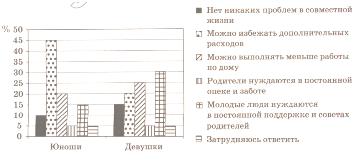В ходе социологического опроса совершеннолетним юношам и девушкам задавали вопрос: «Почему некоторые молодые люди не хотят жить отдельно от родителей?» Полученные результаты (в % от числа опрошенных) представлены в графическом виде.