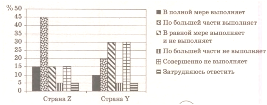В ходе социологических опросов совершеннолетним жителям стран Z и Y задавали вопрос: «В какой мере государство выполняет свои обязанности перед гражданами?» Полученные результаты (в % от числа опрошенных) представлены в графическом виде.