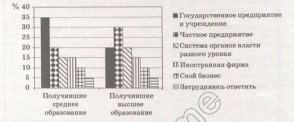 В ходе социологических опросов совершеннолетних жителей страны N им задавали вопрос: «Если бы Вы сейчас устраивались на работу и могли бы свободно выбирать, то где бы Вы предпочли работать?» Полученные результаты (в % от числа опрошенных) представлены в виде диаграммы.