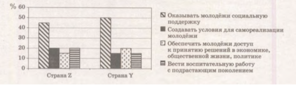 В ходе социологических опросов совершеннолетних жителей стран Z и Y им задавали вопрос: «Какое из направлений молодёжной политики государства Вы считаете наиболее важным?» Полученные результаты опроса (в % от числа опрошенных) представлены в виде диаграммы.