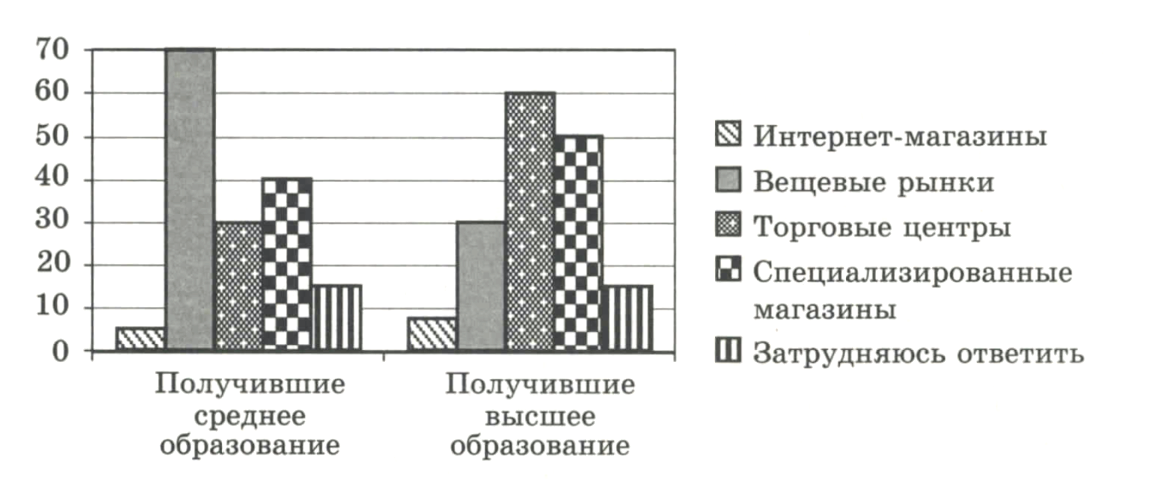 В ходе социологического опроса совершеннолетним гражданам, имеющим разный уровень образования, задавали вопрос: «Где Вы, как правило, покупаете одежду и обувь?» (Можно было выбрать не более двух ответов.) Полученные результаты (в % от числа опрошенных) представлены в графическом виде.