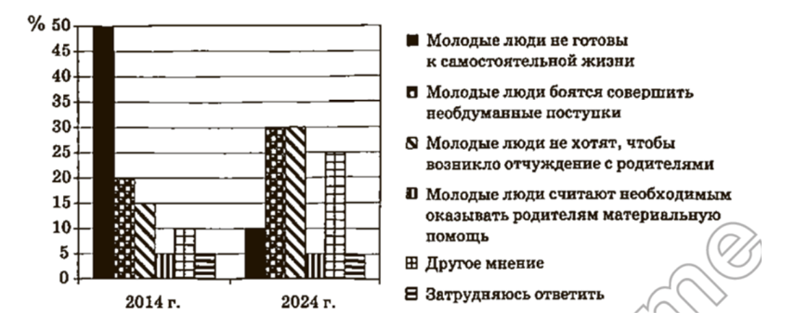 В ходе социологических опросов совершеннолетним гражданам задавали вопрос: «Почему некоторые молодые люди в возрасте 18-25 лет, не состоящие в браке, предпочитают жить вместе с родителями?» (Можно было выбрать несколько ответо). Полученные результаты (в % от числа опрошенных) представлены в графическом виде.