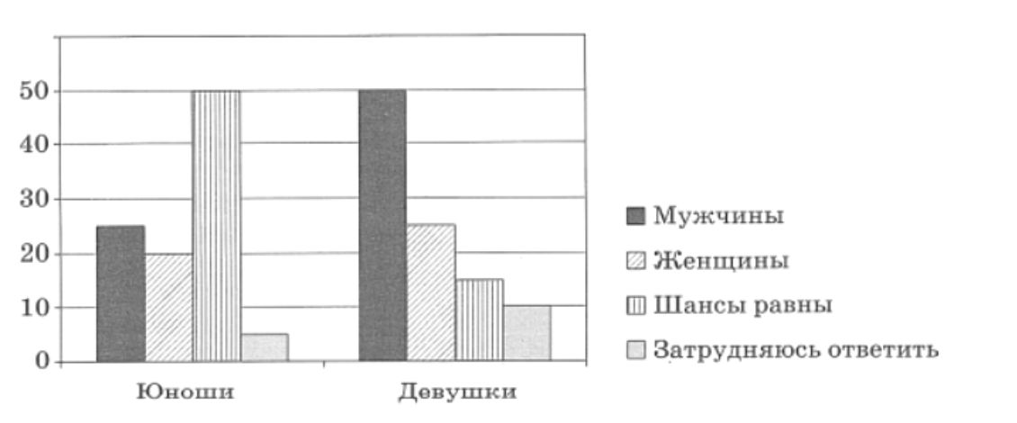 В ходе социологического опроса совершеннолетним юношам и девушкам задавали вопрос: «Кто в современном обществе имеет больше шансов добиться продвижения по службе?». Полученные результаты (в % от числа опрошенных) представлены в графическом виде.