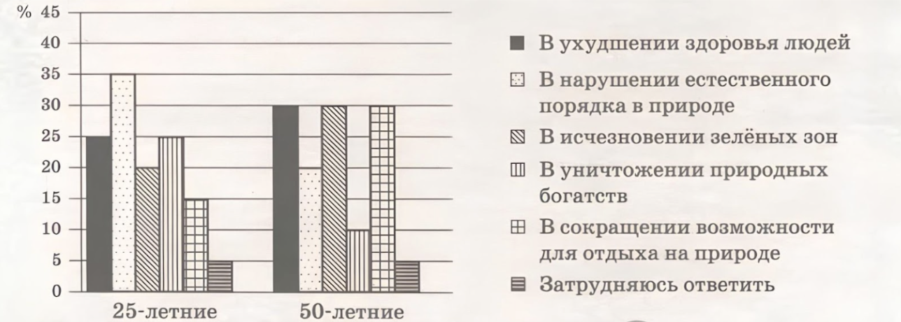 В ходе социологических опросов 25-летним и 50-летним гражданам задавали вопрос: «В чём конкретно проявляется ухудшение окружающей среды в Вашем населённом пункте и его окрестностях?» (Можно было выбрать несколько ответов). Полученные результаты (в % от числа опрошенных) представлены в графическом виде.