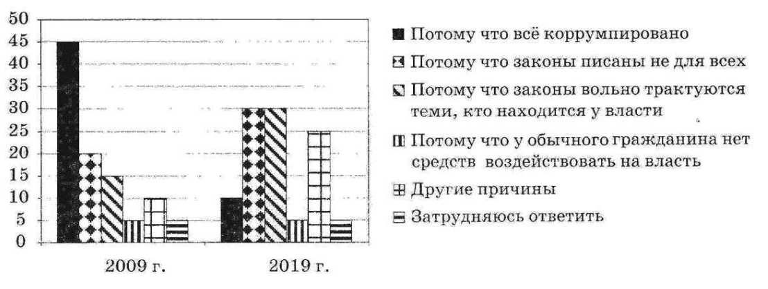 В ходе социологических опросов совершеннолетним гражданам задавали вопрос: «Почему Вы не чувствуете себя под защитой закона?» (Можно было выбрать несколько ответов). Полученные результаты (в % от числа опрошенных) представлены в графическом виде.