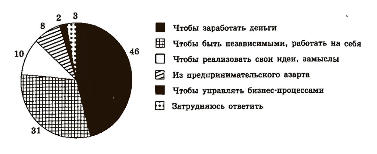 Социологическая служба проводила опрос совершеннолетних граждан. Им задавали вопрос: «Почему, по Вашему мнению, люди занимаются бизнесом?» Полученные результаты (в % от числа опрошенных) представлены в виде диаграммы.