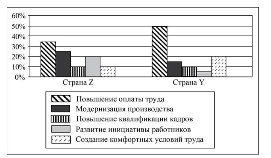 Социологические службы стран Z и Y провели опрос общественного мнения. Участникам опроса был задан вопрос: «Какой способ увеличения производительности труда Вы считаете наиболее эффективным?». Результаты опросов (в % от числа опрошенных) представлены в виде диаграммы.