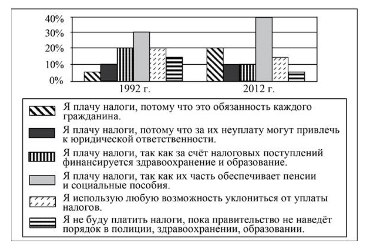 В 1992 и 2012 гг. в стране Z в ходе социологических опросов выясняли отношение совершеннолетних граждан к уплате налогов. Результаты опросов (в % от числа опрошенных) представлены в виде диаграммы.