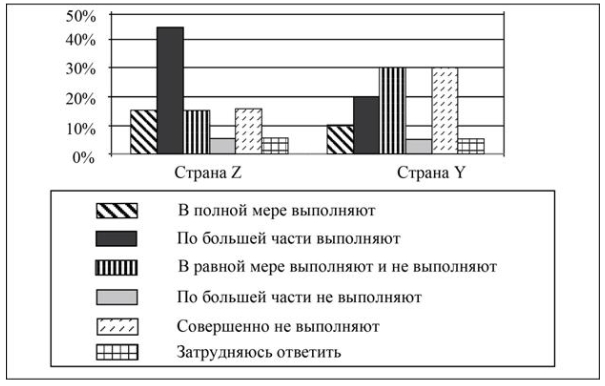 В ходе социологических опросов совершеннолетних жителей стран Z и Y им задавали вопрос: «В какой мере граждане вашей страны выполняют свои обязанности перед государством?» Полученные результаты (в % от числа опрошенных) представлены в виде диаграммы.