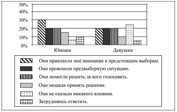 В ходе социологического опроса 25-летних жителей страны N им предложили определить характер влияния социальных сетей и Интернета на их решение голосовать на предстоящих парламентских выборах. Полученные результаты (в % от числа опрошенных) представлены в виде диаграммы.