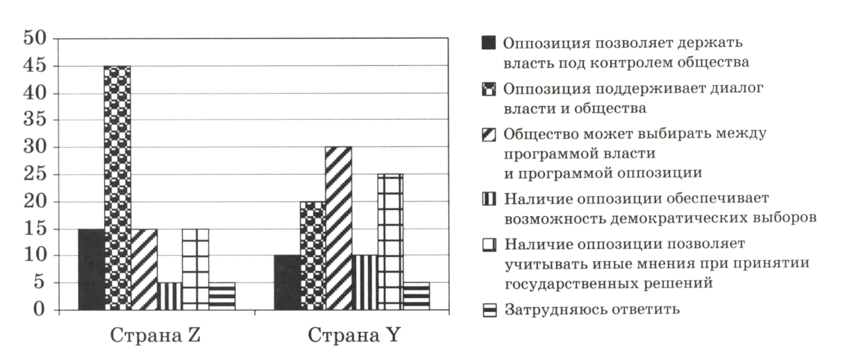 В ходе социологических опросов совершеннолетним жителям стран Z и Y предлагали высказать своё мнение о необходимости оппозиции в политической жизни страны. Полученные результаты (в % от числа опрошенных) представлены в графическом виде.