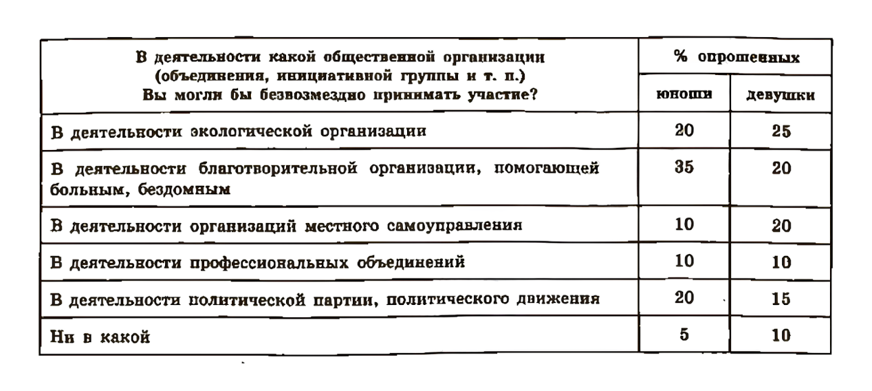 Учёные опросили 20-летних юношей и девушек. Им задавали вопрос: «В деятельности какой общественной организации (объединения, инициативной группы и т. п.) Вы могли бы безвозмездно принимать участие?» Полученные результаты (в % от числа опрошенных) представлены в виде таблицы.
