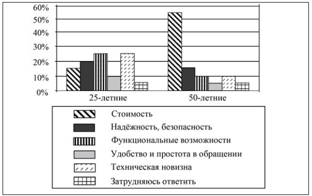 В ходе социологического опроса 25-летних и 50-летних жителей страны N им задавали вопрос: «На что Вы обращаете внимание при покупке технических устройств?» (можно было выбрать несколько ответов). Полученные результаты (в % от числа опрошенных) представлены в виде диаграммы.